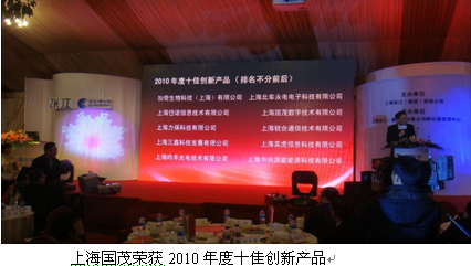 2011年1月18日,在上海張江(集團)有限公司舉辦的“2010年度張江創新風云盛典”上,上海國茂數字技術有限公司榮獲“2010年度十佳創新產品獎”,公司總經理王國中上臺領獎并應邀作為唯一的獲獎企